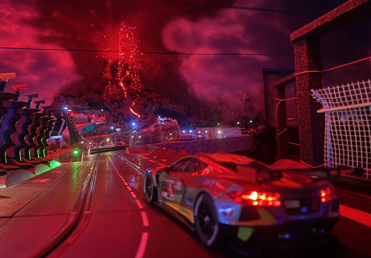 Na úvod vás vždy seznámíme s ovládáním autíček i záludnostmi dráhy. Postupně pak budeme navyšovat rychlost, stejně jako před vás klást i různé překážky. Po zhasnutí světel vás čeká jízda jen za umělého osvětlení okruhu, kdy musíte hlavně hlídat svůj vůz. I proto, že po výbuchu sopky mizí místnost v oblacích dýmu. Navíc nesmíte zapomínat, že na dráze je celá řada dalších pilotů, kteří netouží po ničem jiném, než vám ukázat záda.